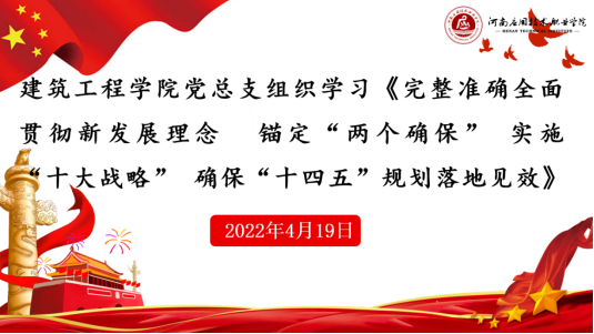 2022年4月19日,建筑工程公司党总支组织全体教师在办公楼516党员活动室学习《完整准确全面贯彻新发展理念 锚定“两个确保” 实施“十大战略” 确保“十四五”规划落地见效》,本次学习采用线上、线下相结合形式进行,旨在贯彻河南省第十一次党代会精神,学习河南省高质量发展战略布局,会议由公司党总支书记马春燕主持。