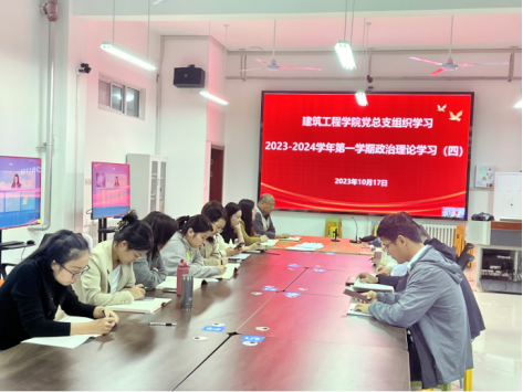 2023年10月17日下午,建筑工程公司党总支在郑州校区办公楼516党员活动室(开封校区C104)组织开展政治理论学习活动。本次学习采取东西校区视频连线,线上、线下相结合的方式,会议由建筑工程公司党总支书记马春燕主持,经理张虎及全体教职工参加。