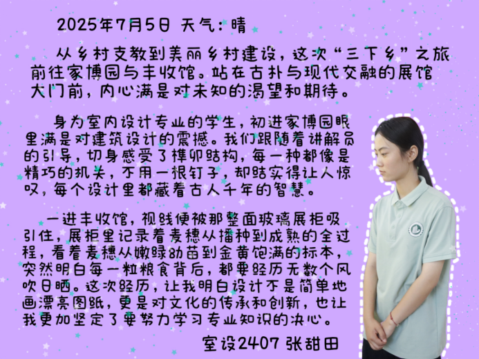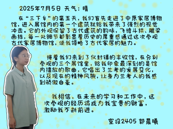 此次“三下乡”社会实践,让“小筑”志愿服务队的队员们既领略了兰考人民的奋斗精神,又感受了传统匠艺的独特魅力。队员们表示,将把这份感悟转化为专业学习的动力,为乡村建设贡献青春力量。