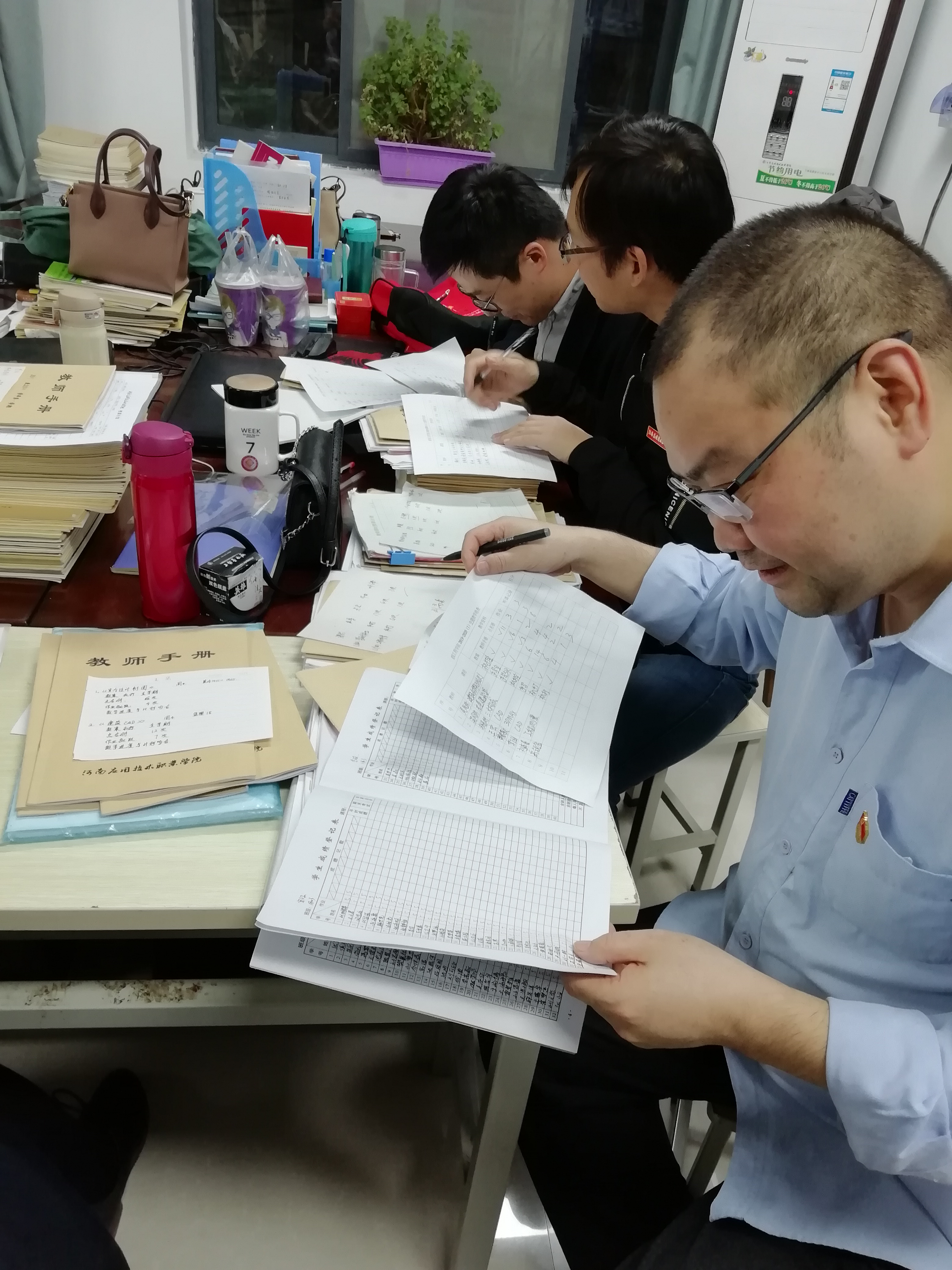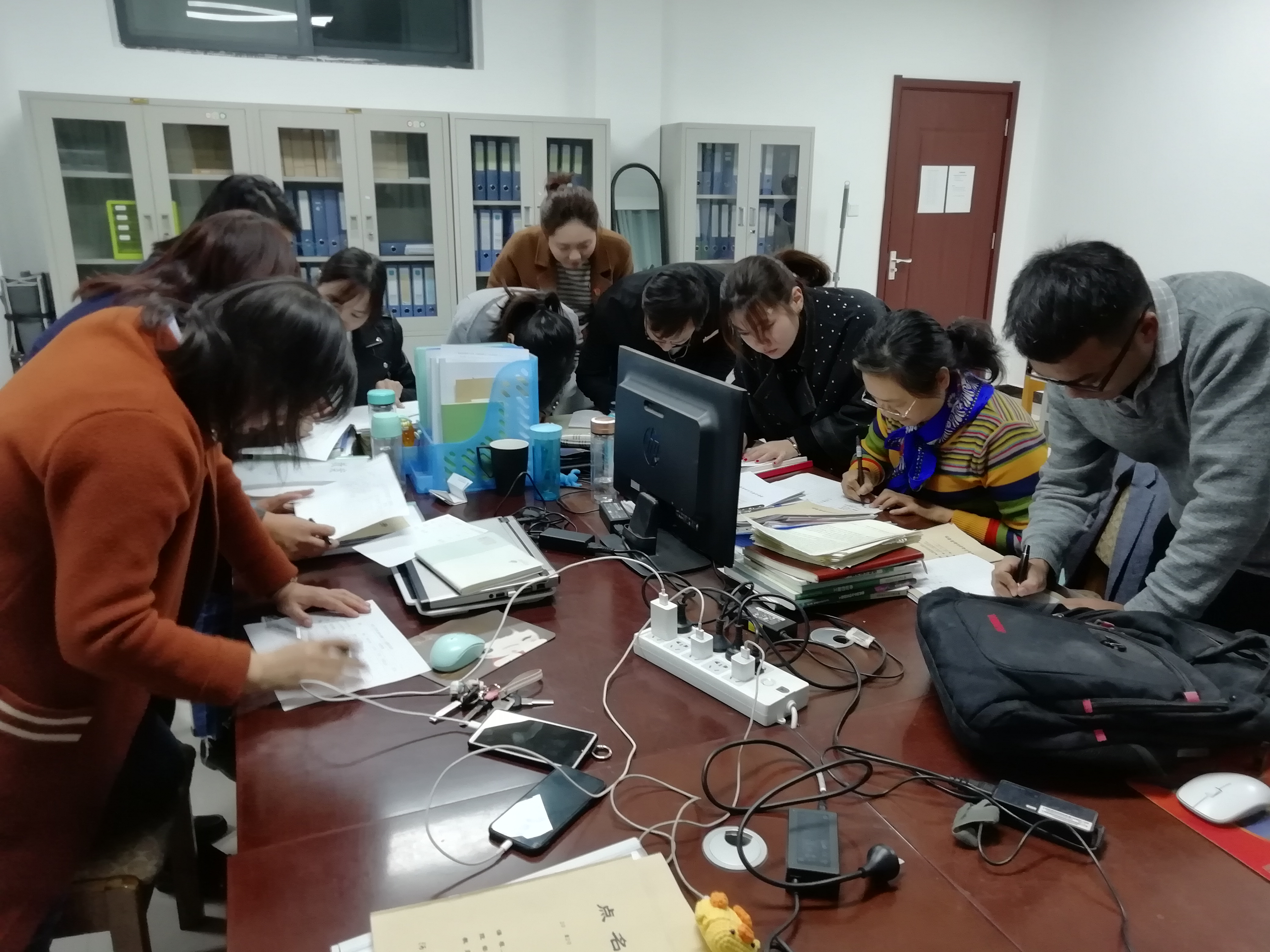 首先,经理张虎向大家通报了10月23日范董事长召开教学工作会议的有关事项,要求大家熟知公司未来总体发展方向,围绕公司中心工作,包括在专业建设发展、实训室建设、教师培训、课堂教学质量、技能竞赛、在线课程建设等方面。接着,两个教研室的老师开始对教案、作业等互相检查,互相评比探讨学习。
