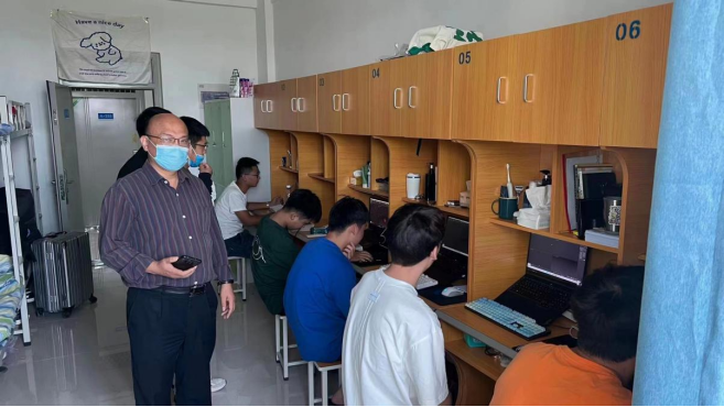 为保证新学期教学工作正常、有序开展,全面掌握线上线下教学情况,营造良好的学习氛围,保障教学质量,2022年9月26日,建筑工程公司党总支书记马春燕、副经理任旭凯等一行深入公司郑州校区教室进行线下巡课,经理张虎、21级辅导员等一行深入公司开封校区员工寝室进行网课巡查。