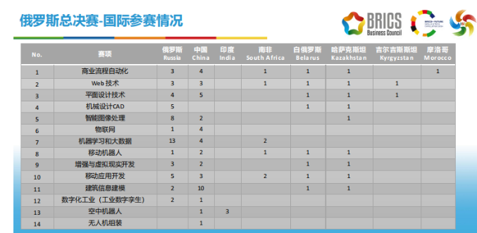 该项赛事由俄罗斯技能发展署(俄罗斯世界技能)、俄罗斯战略倡议署、金砖国家工商理事会、鞑靼斯坦共和国政府、俄罗斯科学和高等教育部、一带一路暨金砖国家技能发展国际联盟、教育部中外人文交流中心主办,是重要的国际赛事之一。汇聚了来自8个国家,114个参赛代表队,围绕14个赛项展开了为期三天的激烈竞技。