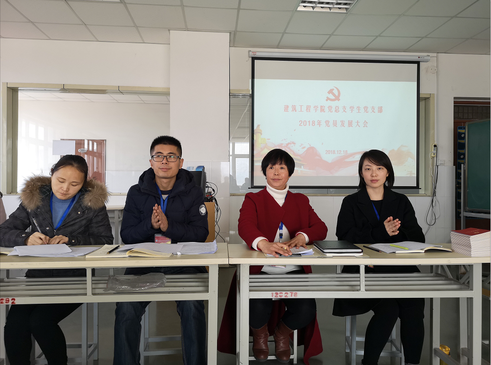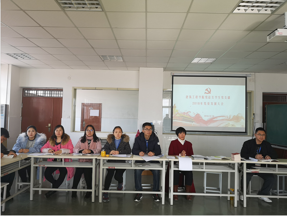2018年12月18日11:00建筑工程公司党总支员工党支部于实训楼E311顺利召开了预备党员发展大会。建筑工程公司党总支书记马春燕同志、员工党支部组织委员任旭凯、员工党支部宣传委员刘亚娟、员工党支部刘高喜同志、吴凤珍同志、王丹丹同志、李慧杰同志八人参加本次会议,党总支纪委委员樊磊、教工党支部冯娇伟同志、张瑾同志列席本次大会,会议主题:建筑工程公司党总支员工党支部2018年接收31名申请人为预备党员的会议。