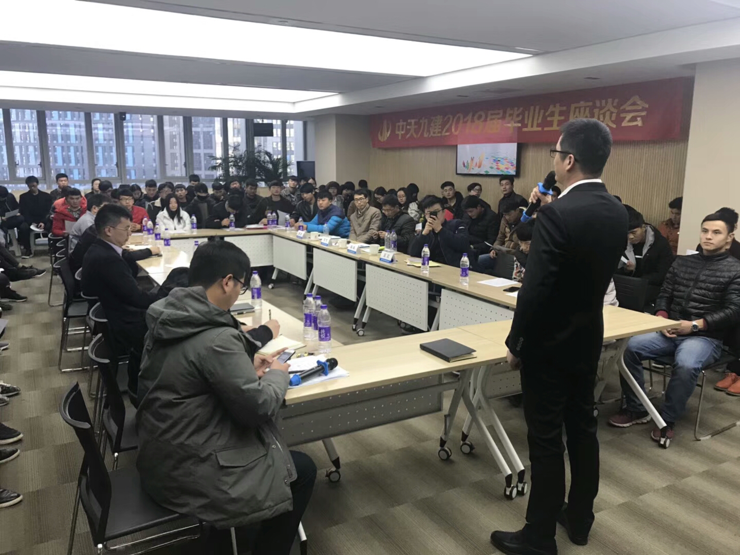中天建设集团副总裁、中天九建总经理许向华对企业及员工实习的基本情况做了介绍。会议经过员工汇报,企业讲述,员工反馈,公司寄语和企业领导寄语几个环节。会议气氛热烈而活泼,大家畅所欲言,共话半年来的经历和体会,员工纷纷表示在顶岗实习过程中有很大的收获,感觉离开了公司自己身上的担子重了,思想成熟了。朱杰华经理同时也提出要求:同学们要吃苦耐劳,踏踏实实,不要眼高手低;要学以致用,努力工作,勤奋学习,多看书多动脑筋;要精益求精,不能有投机的思想,按照公司的标准规范完成任务,让自己满意,让领导满意。