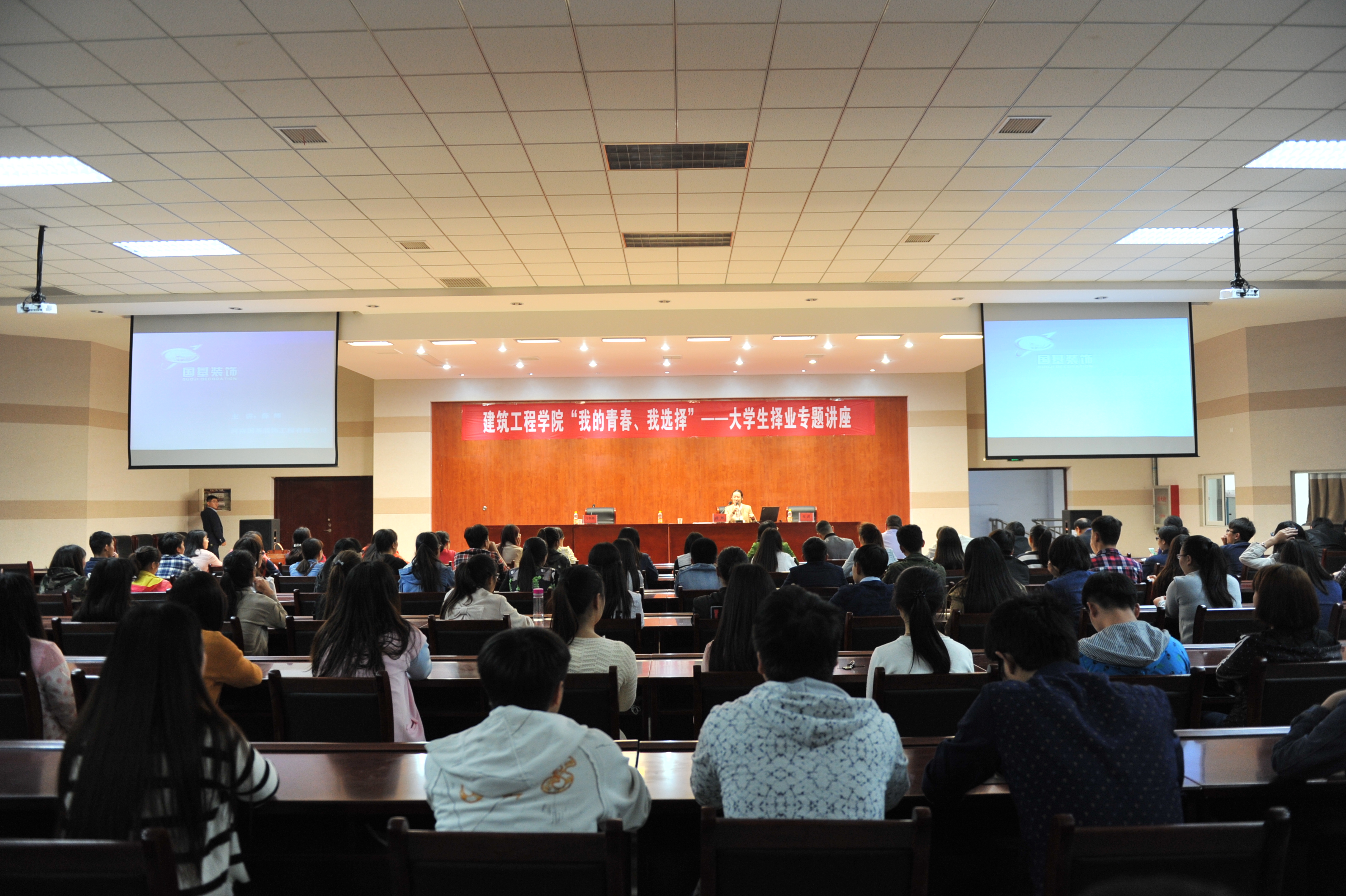 2014级工程造价专业顶岗实习的脚步即将迈出,为进一步完善英国上市官网365老员工就业指导服务体系,公司特邀河南国基装饰工程有限公司总经理薛辉老师14级老员工备战就业进行专题请坐,帮助公司老员工提供更好的就业思路。为更好的让当代老员工了解建筑行业的就业前景,2016年4月26日在实训楼二楼会议厅举办了以“我的青春,我选择”为主题的老员工择业专题讲座。