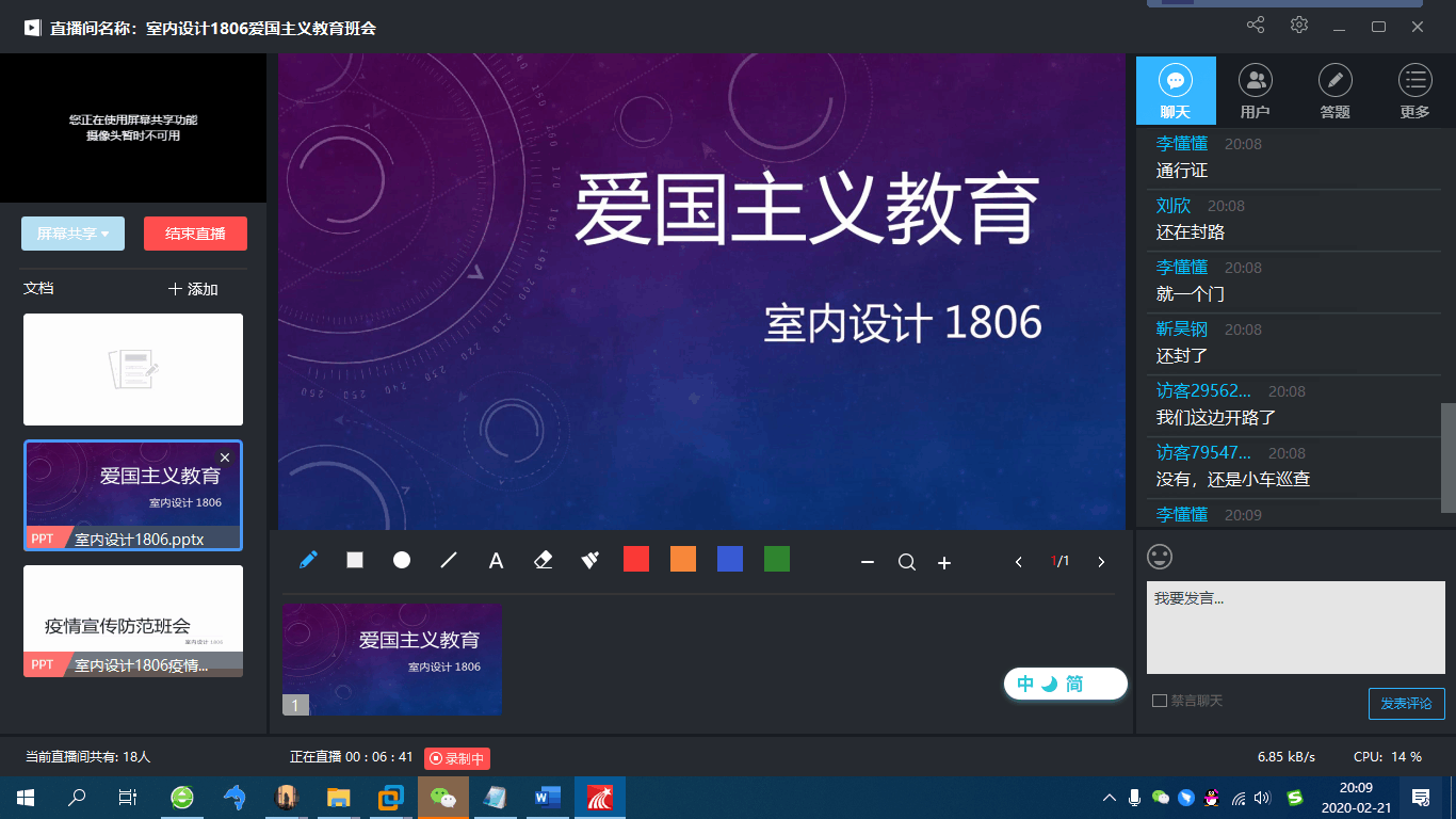 为教育广老员工提高疫情防范意识,深入贯彻落实爱国主义教育,英国上市官网365于2月先后开展了“疫情就是命令,防控就是责任”以及“爱国主义教育”两次主题班会。英国上市官网36542个班级共1480名员工参加,以班级为单位,由20名辅导员主持,依托QQ、企业微信、钉钉等网络方式进行宣传教育会议。