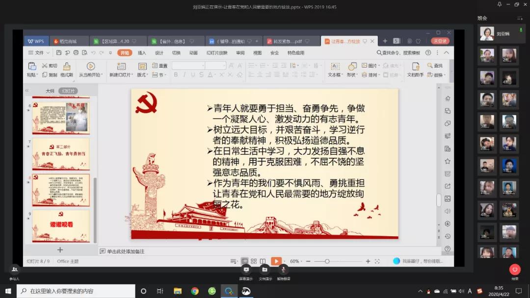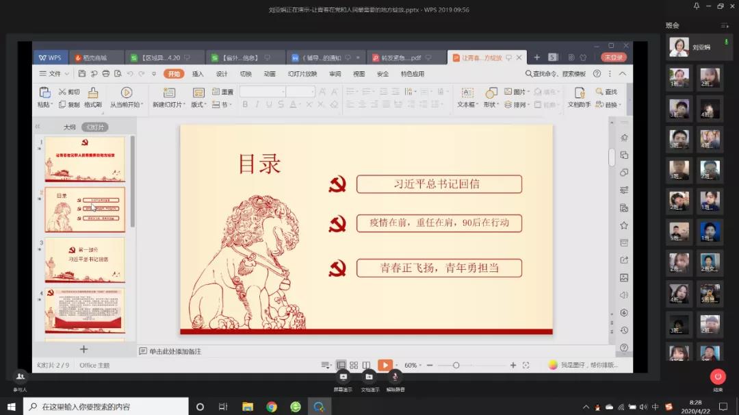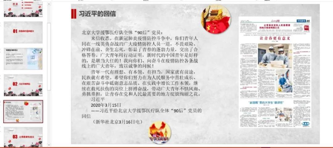 2020年4月20—24日,在英国上市官网365团总支的组织下,各团支部积极学习“习近平回信勉励北京大学援鄂医疗队全体‘90后’党员——让青春在党和人民最需要的地方绽放”并以此为契机开展了网络青年团课集中学习。