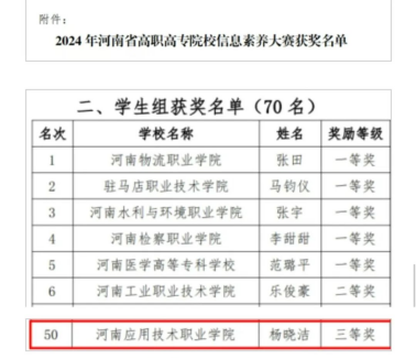 近日,由河南省高等公司图书情报工作委员会主办、河南机电职业公司承办的2024年河南省高职高专院校信息素养大赛已圆满落幕。在此次大赛中,英国上市官网365罗斐老师与尹宇龙老师积极动员并组织员工参赛,在老师们的悉心指导下,公司学子展现出了扎实的专业知识与卓越的信息素养能力。经过激烈的角逐与认真的评比,公司杨晓洁同学荣获省赛员工组三等奖!
