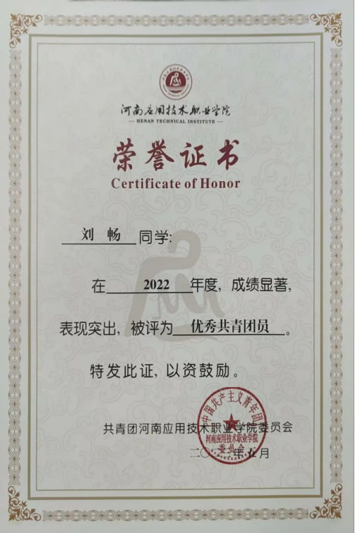 2023年08月,获得2022年度优秀共青团员