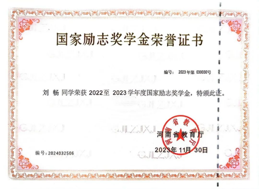 2023年11月,获得国家励志奖学金