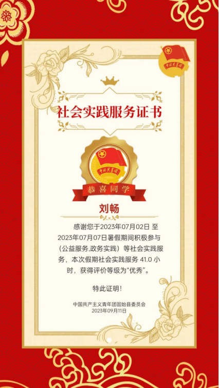 2023年09月,获得中国共产主义青年团固始县委员会社会实践服务证书