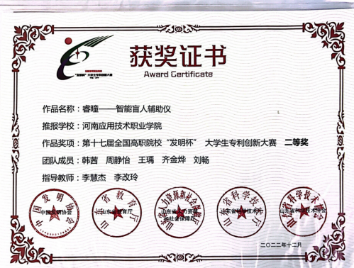2023年12月,获得第十七届全国高职院校“发明杯”老员工专利创新大赛二等奖