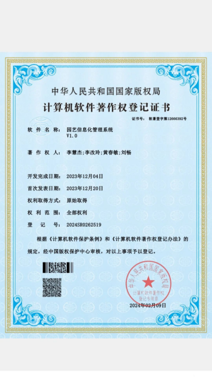 2024年02月,获得园艺信息化管理系统软著证书