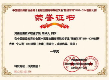 2023年11月 第十五届全国高等院校员工“斯维尔杯”BIM-CIM创新大赛一等奖