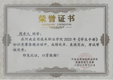 从大一开始,该生就怀揣着对知识的渴望和对未来的憧憬,全身心地投入到学习当中。他深知大学是一个知识的宝库,每一门课程都是通往成长的阶梯。在课堂上,他总是去坐前排,认真听讲,积极回答问题,与老师们互动交流。课后,他会主动复习所学内容,整理笔记,确保真正掌握了每一个知识点。该生深知实践对于专业学习的重要性,因此积极参加各类专业竞赛。2023 年 12 月,在河南省职业院校技能大赛装配式智能建造中,凭借扎实的专业知识和出色的实践能力,荣获一等奖。为了准备这次比赛,他投入了无数个日夜进行刻苦训练,反复钻研比赛规则和技术要点,与团队成员共同探讨解决方案。同年 11 月,在河南省“建美中原”大赛中获得二等奖。2024 年6 月的金砖国家职业技能大赛第三赛区区域赛取得了二等奖的好成绩。7月在金砖国家职业技能大赛国赛中,他不畏强手,奋勇拼搏,斩获二等奖。此外,2023 年 11 月的第十五届“斯维尔”建筑大赛中,勇夺一等奖。这些竞赛经历不仅让他提升了专业技能,还培养了他的团队协作精神和创新思维能力。在学习的道路上,该生将继续保持勤奋努力、积极进取的态度,不断追求卓越,为实现自己的人生目标而努力奋斗。积极参加各类省级以上职业技能比赛和创新创业比赛,在比赛中锻炼自己的实践能力和创新思维。通过不断挑战自我,积累了丰富的比赛经验,提升了专业技能水平,在未来的学习道路上,该生将继续保持积极进取的态度,不断提升自己的专业技能和综合素质,为实现自己的人生目标而努力奋斗。