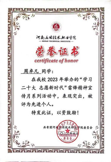 在日常生活中,该生注重自身品德修养,践行社会主义核心价值观。以诚实守信、团结友爱、助人为乐为行为准则,积极关心和帮助身边的同学。积极参与公司的各项思想教育活动,如“学习二十大 志愿新时代”雷锋精神宣传月系列活动等,在活动中不断提升自己的思想境界。
