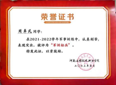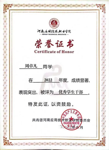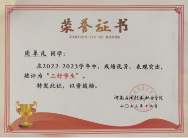 周卓凡,男,汉族,河南商丘人,2003年3月出生,中共预备党员,2022级建设工程管理专业1班班长,2022-2024学年全公司成绩加权成绩第一,专业成绩排名第一。在校期间学习成绩优异、积极参加各类活动及专业技能比赛。荣获国际奖项1个,国家专利1项,国赛奖项2个,省以上荣誉9个,校级院级荣誉证书十余项。