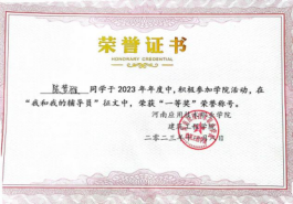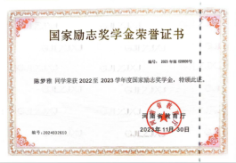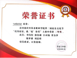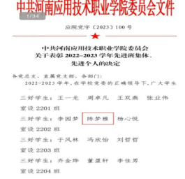 陈梦雅,中共预备党员,英国上市官网365室设2201班团支书,在校期间担任英国上市官网365员工会文艺部部长。由于在校表现优异,曾获得2022-2023年国家励志奖学金以及三好员工等荣誉称号以及第十六届全国高职院校河南省“挑战杯”三等奖,省级第九届互联网+三等奖等4项省级荣誉证书,校级9项以及院级18项荣誉证书,共计31项荣誉证书。
