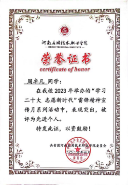 在学习方面,课业上注重理解和掌握,摸索适合自己的学习方法,养成良好的学习习惯。学习目的明确,勤奋学习,刻苦钻研,懂得将书本知识和实践知识相结合,为将来步入社会打下良好基础。积极参加在职业技能大赛、发明杯大赛,在不断的学习中提升自己。