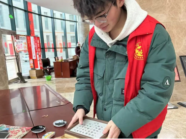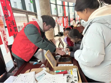 新年集市活动期间,乔西昊主要负责在活字印刷这个非遗摊位协助工作。在剪纸摊位,他向游客们介绍活字印刷的历史渊源,讲述着活字印刷术在岁月长河中的演变。遇到小朋友们,他就手把手教他们如何刷墨看着孩子们印出歪歪扭扭却充满童趣的作品,脸上洋溢着满足的笑容。