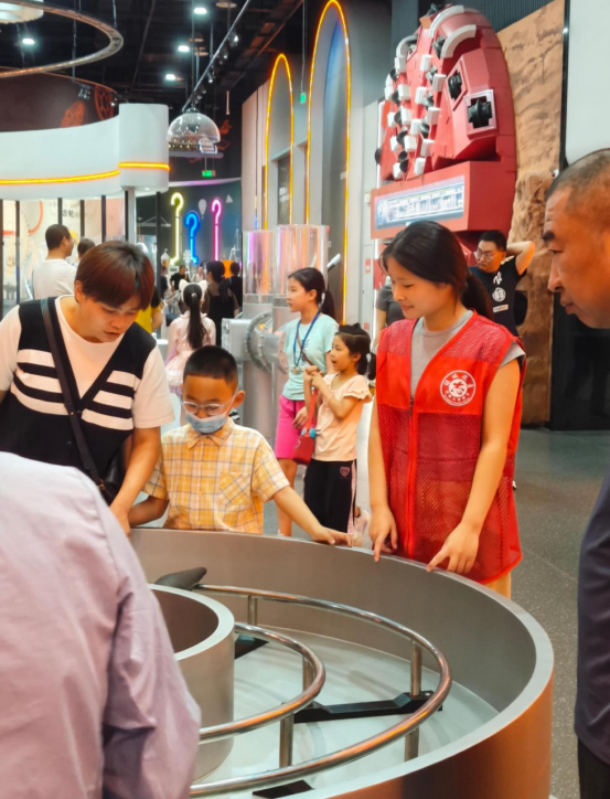 活动中,志愿者们承担起展厅引导、展品讲解、互动体验协助等工作。在“奇妙物理世界”展区,志愿者们化身“科学讲解员”,通过生动比喻和趣味实验,将深奥的力学原理转化为通俗易懂的知识,让孩子们直观感受科学魅力;在VR体验区,志愿者们耐心指导参观者正确使用设备,帮助他们安全体验虚拟现实技术,赢得阵阵好评;在秩序维护区,志愿者们时刻关注场馆动态,提醒参观者文明观展,为大家营造舒适的参观环境。