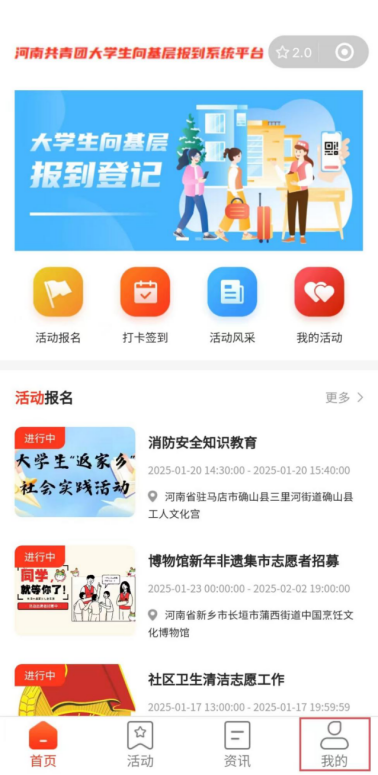 3. 注册完成后,同学们可在寒假期间随时登录“向基层报到”系统平台进行查看家乡岗位活动、活动报名、活动签到签退等操作。