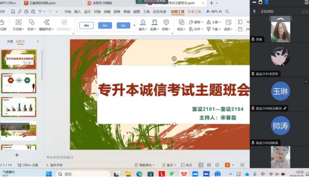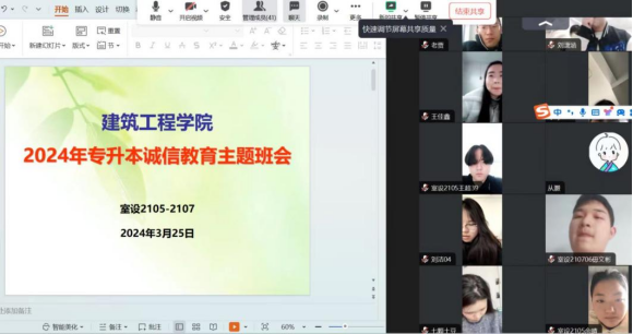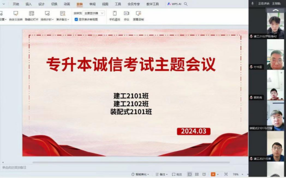 为树立员工诚信考试意识,确保2024年专升本考试安全有序、捍卫考试公平公正,进一步落实立德树人根本任务,3月18日至3月26日,21级各班级以线上的方式开展了2024年专升本诚信考试教育主题班会,会议由各班辅导员主持,专升本考生全部参加。